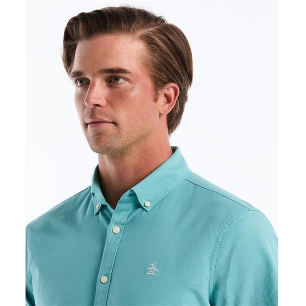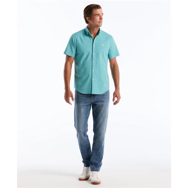 Elevate your casual wardrobe with the Penguin Oxford Stretch Short Sleeve Shirt in a refreshing aqua hue. This shirt effortlessly blends classic style with modern comfort, making it an ideal choice for both laid-back and polished occasions.
